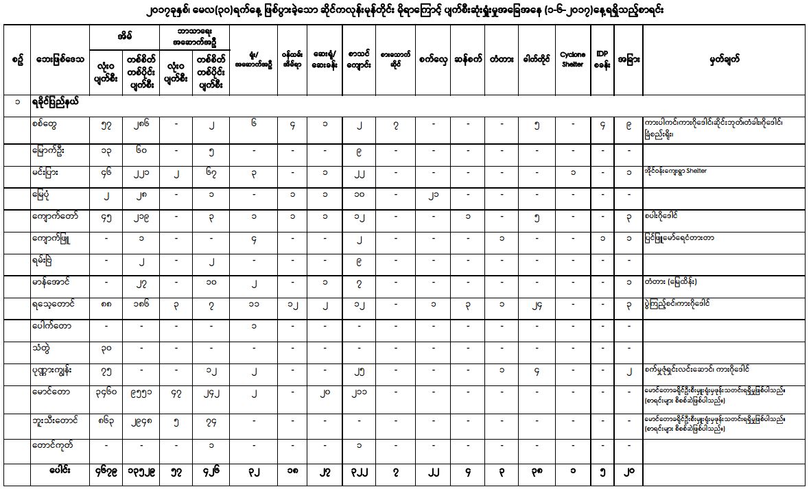 ၂၀၁၇ ခုနှစ်၊ မေလ (၃၀) ရက်နေ့ ဖြစ်ပွားခဲ့သော ဆိုင်ကလုန်းမုန်တိုင်း “မိုရာ” ကြောင့် ပျက်စီးဆုံးရှုံးမှုအခြေအနေ (၁-၆-၂၀၁၇)