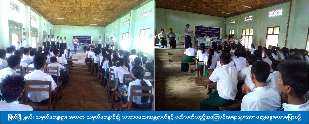 (၁-၆-၂၀၁၇) ရက်နေ့တွင် မြိတ်ခရိုင်ဦးစီးမှူးရုံး (ကဆရ) မှ တာဝန်ရှိသူများသည် မြိတ်မြို့နယ်၊ သမုတ်ကျေးရွာ၊ အထက သမုတ်ကျောင်း၌ သဘာဝဘေးအန္တရာယ်နှင့် ပတ်သက်သည့်အကြောင်းအရာများအား ဆွေးနွေးဟောပြောခြင်း၊ ဆောင်ရန်/ရှောင်ရန််များ ဟောပြောခဲ့ပြီး တက်ရောက်လာကြသည့် ရပ်မိရပ်ဖ၊ ဆရာ/ဆရာမနှင့် ကျောင်းသား/ကျောင်းသူဦးရေ (၁၄၀) ဦးခန့်ထံ လက်ကမ်းစာစောင်များ၊ နံရံကပ်ပိုစတာများ၊ ဘောပင်နှင့် ဆပ်ပြာမှုန့်ထုပ်များအား ဝေငှပေးခဲ့ကြောင်း သိရှိရပါသည်။