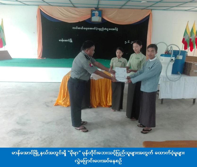 မာန်အောင်မြို့နယ်အတွင်းရှိ “မိုရာ” မုန်တိုင်းကြောင့် ဘေးသင့်ခဲ့သည့် အိမ်ထောင်စု (၂၇) စုအတွက် ဆန်ရိက္ခာဖိုးငွေ (၁၉၁၁၀၀) ကျပ်နှင့် အိမ်ဆောက်ပစ္စည်းဖိုး (၃၆၀၀၀၀) ကျပ်တို့ကို ကယ်ဆယ်ရေးနှင့် ပြန်လည်နေရာချထားရေးဦးစီးဌာန၊ ကျောက်ဖြူခရိုင်ဦးစီးမှူးရုံးမှ တာဝန်ရှိသူများက မာန်အောင်မြို့နယ်ထွေ/အုပ်မှ တာဝန်ရှိသူများထံ (၅-၆-၂၀၁၇) ရက်နေ့တွင် လွှဲပြောင်းထောက်ပ့ံခဲ့ကြောင်း သိရှိရပါသည်။