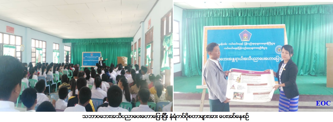 ကယ်ဆယ်ရေးနှင့်ပြန်လည်နေရာချထားရေးဦးစီးဌာန၊ မိုင်းဖြတ်မြို့နယ် ဦးစီးမှူးရုံးမှ တာဝန်ရှိသူများသည် (၉-၆-၂၀၁၇) ရက်နေ့၊ နံနက် ၁၀ နာရီတွင် မိုင်းဖြတ်မြို့နယ် အထက (မိုင်းဖြတ်) စာသင်ကျောင်းတွင် ဆရာ/ဆရာမ နှင့် ကျောင်းသားဦးရေ (၁၅၀) ခန့်အား လက်ကမ်းစာ စောင်များဖြန့်ဝေပေးပြီး ကျောင်းအုပ်ကြီးအား နံရံကပ်ပိုစတာများပေးအပ်ခဲ့ပါသည်။ ညနေ (၁း၀၀) နာရီအချိန်တွင် မိုင်းဖြတ်မြို့ရှိ အ.လ.က(ခွဲ) စာသင်ကျောင်းတွင် ကျောင်းသားဦးရေ (၈၀) ခန့်အား သဘာဝဘေးအသိပညာပေးဟောပြောဆွေးနွေးခဲ့ပြီး လက်ကမ်းစာစောင်များဖြန့်ဝေ ပေးကာ ကျောင်းအုပ်ကြီးအား နံရံကပ်ပိုစတာများပေးအပ်ခဲ့ကြောင်း သတင်းရရှိပါသည်။