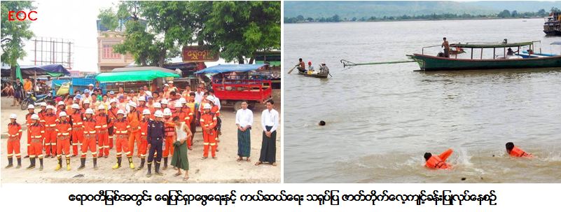 ကယ်ဆယ်ရေးနှင့်ပြန်လည်နေရာချထားရေးဦးစီးဌာန၊ ကချင်ပြည်နယ်ဦးစီးမှူးရုံးမှ တာဝန်ရှိသူများသည် ကချင်ပြည်နယ် ရွှေကူမြို့နယ်တွင်သဘာဝဘေးလျော့ပါးရေးစေတနာ့ ဝန်ထမ်းလူငယ်(မွမ်းမံ)သင်တန်းတက်ရောက်နေကြသော မြို့နယ်အတွင်းရှိ ရပ်ကွက်နှင့် ကျေးရွာအုပ်စုများမှ သင်တန်းသားများအား ဧရာဝတီမြစ်အတွင်း ရေပြင်ရှာဖွေရေးနှင့် ကယ်ဆယ်ရေး သရုပ်ပြ ဇာတ်တိုက်လေ့ကျင့်ခန်းကို (၁၂-၆-၂၀၁၇) ရက်နေ့ မွန်းလွဲ (၁) နာရီက သင်္ဘောဆိပ်တွင် ပြုလုပ်ခဲ့ရာ ရွှေကူမြို့နယ် အထွေထွေအုပ်ရေးဦးစီးဌာနမှ တာဝန်ရှိသူများလည်းတက်ရောက်ခဲ့ကြောင်း သတင်းရရှိပါသည်။