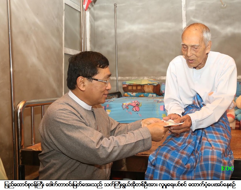 လူမှုဝန်ထမ်း၊ ကယ်ဆယ်ရေးနှင့်ပြန်လည်နေရာချထားရေးဝန်ကြီးဌာန၊ ပြည်ထောင်စုဝန်ကြီး ဒေါက်တာဝင်းမြတ်အေးသည် ယနေ့နံနက်ပိုင်းက နေပြည်တော်ကောင်စီနယ်မြေ၊ ပျဉ်းမနားမြို့၊ မင်္ဂလာရပ်သို့ သွားရောက်ပြီး ဦးဖေချစ် (၁၀၁)နှစ်၊ ဒေါ်ကြည်ကြည်(၁၀၀)နှစ် အပါအဝင်အသက် (၉၀) နှစ်နှင့်အထက် ဘိုးဘွား (၁၀) ဦးအတွက် တစ်ဦးလျှင် (၃) လစာထောက်ပံ့ငွေကိုဘိုးဘွားများလက်ဝယ်သို့ အိမ်တိုင်ရာရောက် ရိုသေစွာသွားရောက်ထောက်ပံ့ပေးအပ်ခဲ့ပါသည်။