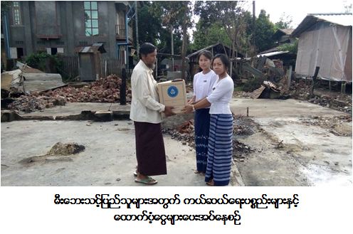 ကချင်ပြည်နယ်၊ ဝိုင်းမော်မြို့၊ အမှတ် (၁) ရပ်ကွက်တွင် (၁၀.၆.၂၀၁၇) ရက်နေ့ဖြစ်ပွားသော မီးဘေးကြောင့် ဘေးသင့်အိမ်ထောင်စု (၃) စု လူဦးရေ (၁၀) ဦးတို့ အတွက် ကယ်ဆယ်ရေးပစ္စည်း (၉) မျိုး၊ အိမ်ဆောက်ပစ္စည်းဖိုးငွေ (၆၀၀၀၀၀)ကျပ်၊ ဆန်ရိက္ခာဖိုးငွေ (၂၁၀၀၀) ကျပ်တို့ကို (၁၆.၆.၂၀၁၇)ရက်နေ့တွင် ကချင်ပြည်နယ်ဦးစီးမှူးရုံးဝန်ထမ်းများမှ ကွင်းဆင်းထောက်ပ့ံပေးခဲ့ကြောင်း သတင်းရရှိပါသည်။