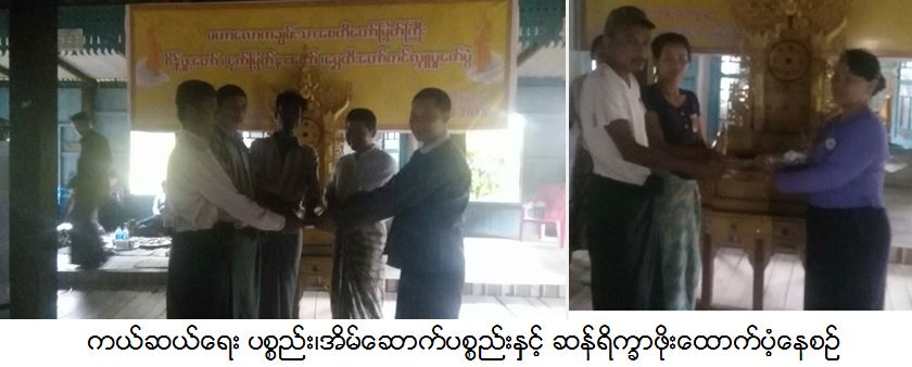ကယ်ဆယ်ရေးနှင့်ပြန်လည်နေရာချထားရေးဦးစီးဌာန၊ ပြည်ခရိုင််ဦးစီးမှူးရုံးမှ တာဝန်ရှိသူများသည် သာယာဝတီခရိုင်၊ မိုးညိုမြို့နယ်အတွင်း ကျေးရွာအုပ်စု(၇)စု ကျေးရွာ(၇)ရွာနှင့် ရပ်ကွက်(၁) ခု၌(၄.၆.၂၀၁၇)နှင့် (၅.၆.၂၀၁၇) နေ့တို့ဖြစ်ပွားခဲ့သော လေဘေးသင့် ပြိုပျက်အိမ်(၁၂)လုံး ယင်းမှလူ(၃၆)ဦး နှင့် အမိုးလန်ပျက်စီးအိမ်(၃၁)လုံး ဘုန်းကြီးကျောင်း(၁)ကျောင်းတို့အတွက် ကယ်ဆယ်ရေးပစ္စည်း(၉)မျိုး (၁၂) အိမ်ထောင်စာနှင့် ဆန်ဖိုးနှင့်အိမ်/ ကျောင်းဆောက်ပစ္စည်းဖိုး(၂၂၀၇၅၀၀ိ/-) ကျေးရွာအုပ်စု(၃)စု ၌(၁၁.၆.၂၀၁၇)နေ့ ဖြစ်ပွားခဲ့သော လေဘေးသင့် ပြိုပျက်အိမ်(၁)လုံး အမိုးလန်ပျက်စီးအိမ် (၄)လုံးတို့အတွက် ကယ်ဆယ်ရေးပစ္စည်း(၉)မျိုး (၁)အိမ်ထောင်စာနှင့် အိမ်ဆောက်ပစ္စည်းဖိုး(၃၂၁၀၀၀/-) ကျေးရွာအုပ်စု(၄)စု၌ (၁၂.၆.၂၀၁၇)နေ့ ဖြစ်ပွားခဲ့သော လေဘေးသင့် ပြိုပျက်အိမ် (၂)လုံး ယင်းမှလူ(၁၀)ဦးနှင့်အမိုးလန်ပျက်စီးအိမ်(၇)လုံးတို့အတွက် ကယ်ဆယ်ပစ္စည်း(၉)မျိုး (၂)အိမ်ထောင် စာနှင့် ဆန်ဖိုးနှင့် အိမ်ဆောက်ပစ္စည်းဖိုး(၄၆၄၀၀၀/-) ဇောတိကရပ်ကွက် စျေးချို(၂)လမ်း၌ (၁၅.၆.၂၀၁၇)နေ့ဖြစ်ပွားခဲ့သော မီးဘေးသင့် အိမ်(၁)လုံး ယင်းမှလူ(၁)ဦးအတွက် ကယ်ဆယ်ရေးပစ္စည်း(၉)မျိုးနှင့် အလှူပစ္စည်း(၈)မျိုးပါ(Family Kits) (၁) အိမ်ထောင်စာ ဆန်ဖိုးနှင့်အိမ်ဆောက်ပစ္စည်းဖိုး(၂၀၂၁၀၀/-) စုစုပေါင်း ကယ်ဆယ်ရေးပစ္စည်း(၉)မျိုး(၁၆)အိမ်ထောင်းစာ အလှူပစ္စည်း(၈)မျိုးပါ(Family Kits) (၁)အိမ်ထောင်စာ နှင့် ထောက်ပ့ံရန်ပုံငွေပေါင်း(၃၁၉၄၆၀၀/-)အား (၂၁-၆-၂၀၁၇)နေ့တွင် သွားရောက်ထောက်ပံ့ပေးအပ်ခဲ့ကြောင်း သတင်းရရှိပါသည်။Source:ပြည်ခရိုင််ဦးစီးမှူးရုံး(ကဆရ)