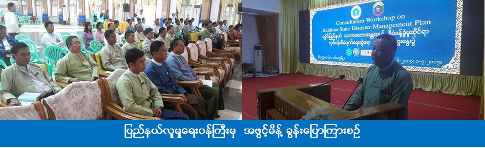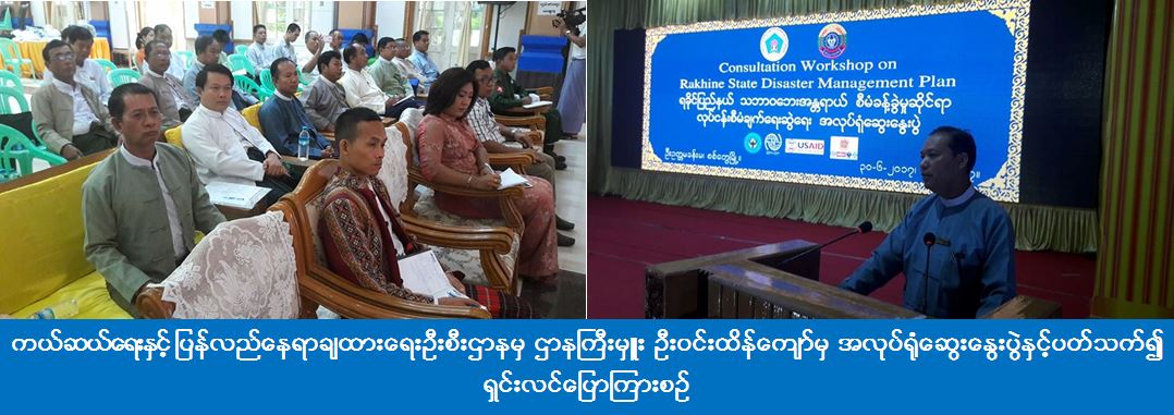 ရခိုင်ပြည်နယ်၊ စစ်တွေမြို့၊ ဦးဥတ္တမခန်းမ၌ (၃၀-၆-၂၀၁၇) ရက်နေ့၊ (၀၉း၃၀) နာရီအချိန်တွင် ကယ်ဆယ်ရေးနှင့် ပြန်လည်နေရာချထားရေးဦးစီးဌာနနှင့် (IOM) အဖွဲ့အစည်းတို့ပူးပေါင်း၍ “ရခိုင်ပြည်နယ် သဘာဝဘေးအန္တရာယ် စီမံခန့်ခွဲမှုဆိုင်ရာ လုပ်ငန်းစီမံချက်ရေးဆွဲရေး အလုပ်ရုံဆွေးနွေးပွဲ” အခမ်းအနားကျင်းပပြုလုပ်ရာ ပြည်နယ်လူမှုရေးဝန်ကြီးမှ အဖွင့်မိန့်ခွန်းပြောကြားပြီး၊ ကယ်ဆယ်ရေးနှင့် ပြန်လည်နေရာချထားရေးဦးစီးဌာန(ရုံးချုပ်) အရေးပေါ်စီမံခန့်ခွဲမှုဗဟိုဌာနမှ ဌာနကြီးမှူး ဦးဝင်းထိန်းကျော်မှ အလုပ်ရုံဆွေးနွေးပွဲနှင့်ပတ််သက်၍ ရှင်းလင်းပြောကြားခြင်း၊ IOM အဖွဲ့အစည်းမှ တာဝန်ရှိသူ Dedy Alfian မှ ဆွေးနွေးပွဲနှင့်ပတ်သက်၍ ရှင်းလင်းပြောကြားခဲ့ကြပါသည်။ အလုပ်ရုံဆွေးနွေးပွဲသို့ ရခိုင်ပြည်နယ်အစိုးရအဖွဲ့မှ ပြည်နယ်လူမှုရေးဝန်ကြီး၊ ပြည်နယ်တိုင်းရင်းသားရေးရာဝန်ကြီးနှင့် ရခိုင်ပြည်နယ် သဘာဝဘေးစီမံခန့်ခွဲမှု ကော်မတီဝင်များ၊ ပြည်နယ်အဆင့်ဌာနဆိုင်ရာများ၊ ခရိုင် သဘာဝဘေးစီမံခန့်ခွဲမှု ကော်မတီဥက္ကဌများ၊ မြို့နယ်သဘာဝဘေးစီမံခန့်ခွဲမှုကော်မတီဥက္ကဌများ၊ နိုင်ငံတကာအဖွဲ့အစည်းများမှ ကိုယ်စားလှယ်များ စုစုပေါင်း (၆၀) ဦးတက်ရောက်ခဲ့ပါသည်။ အဆိုပါအလုပ်ရုံဆွေးနွေးပွဲအား (၃၀-၆-၂၀၁၇) ရက်နေ့မှ (၁-၇-၂၀၁၇) ရက်နေ့ထိ (၂) ရက်တာ ကျင်းပပြုလုပ်မည်ဖြစ်ကြောင်း သိရှိရပါသည်။