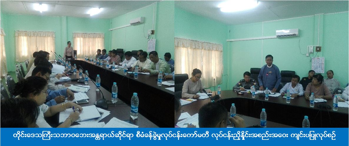 (၄-၇-၂၀၁၇) ရက်နေ့၊ (၁၄းဝ၀) နာရီအချိန်တွင် ပုသိမ်မြို့၊ ဧရာဝတီတိုင်းဒေသကြီးအစိုးရအဖွဲ့ရုံး အစည်းအဝေးခန်းမ (၂) ၌ တိုင်းဒေသကြီးသဘာဝဘေးအန္တရာယ်ဆ်ိုင်ရာစီမံခန့့်ခွဲမှုလုပ်ငန်းကော်မတီ လုပ်ငန်းညှိနှိုင်းအစည်းအဝေးကို ကျင်းပပြုလုပ်ခဲ့ပါသည်။ အစည်းအဝေးတွင် တိုင်းဒေသကြီးသဘာဝဘေးအန္တရာယ်စီမံခန့်ခွဲမှုလုပ်ငန်းကော်မတီ ဥက္ကဌ လူမှုရေးဝန်ကြီးဒေါက်တာလှမြတ်သွေးမှ အဖွင့်အမှာစကားပြောကြားပြီး တိုင်းအဆင့်ဌာနဆိုင်ရာများမှ တက်ရောက်၍ ရေဘေးကြိုတင်ပြင်ဆင်ရေးလုပ်ငန်းဆောင်ရွက်မှုများနှင့်စပ်လျဉ်းပြီး ဆွေးနွေးခဲ့ပါကြောင်း တင်ပြအပ်ပါသည်။