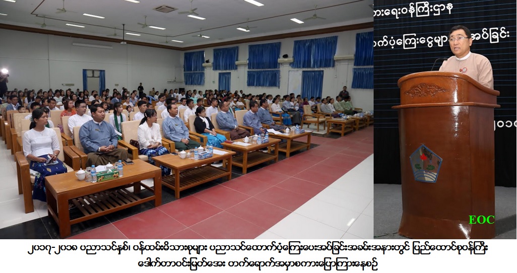 ပြည်ထောင်စုဝန်ကြီးက ဝန်ထမ်းများသည် တိုင်းပြည်ဝန်ကိုထမ်းဆောင်နေရသလို မိသားစုအိမ်ထောင့်ဝန်ကိုလည်း ထမ်းဆောင်နေရ ကြောင်း၊ သားသမီးများအတွက် မိဘများ၏တာဝန်သည် ပညာအမွေပေးခြင်းဖြစ်ရာ ငွေကြေးမတတ်နိုင်သော ဝန်ထမ်းအများစုသည် ပညာရေး အတွက် ဝန်ထုပ်ဝန်ပိုးဖြစ်ကြရသည်ကိုတွေ့ရှိရကြောင်း၊ ထိုဝန်ထုပ်ဝန်ပိုးများကိုလျော့ချရန် သက်ဆိုင်ရာဝန်ကြီးဌာနများက ကြိုးစားပေးနေ သလို မိမိတို့အနေဖြင့်လည်းမိမိတို့၏ ဝန်ထမ်းများကိုပံ့ပိုးကူညီရန်လိုအပ်သဖြင့် ယခု ၂၀၁၇-၂၀၁၈ ပညာသင်နှစ်၊ ဝန်ထမ်းမိသားစုများ ပညာ သင်ထောက်ပံ့ကြေးပေးအပ်ခြင်းအခမ်းအနားကို ကျင်းပရခြင်းဖြစ်ကြောင်း၊ အခြေခံပညာအောင်မြင်ပြီး အဆင့်မြင့်ပညာသင်ယူကြမည့် ဝန်ထမ်း သားသမီးသည် မိမိတို့လက်တွေ့ပြန်လည်အသုံးချ၍ရသော အသက်မွေးဝမ်းကြောင်းအတွက် အထောက်အကူပြုသော ပညာရပ်များကို တတ်မြောက်အောင် ရွေးချယ်ဆည်းပူးသင့်ကြောင်း၊ ပညာကိုလေ့လာရာတွင် အချက်အလက်များကိုအလွတ်မှတ်သားခြင်းထက် အဓိပ္ပါယ် ပေါက်၍ ပြန်လည်အသုံးချနိုင်သောလေ့လာနည်းများဖြင့် တတ်မြောက်အောင် ဆောင်ရွက်ကြစေလိုကြောင်း ပြောကြားခဲ့ပါသည်။
