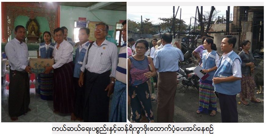 ကယ်ဆယ်ရေးနှင့်ပြန်လည်နေရာချထားရေးဦးစီးဌာန၊ မန္တလေးတိုင်းဒေသကြီးဦးစီးမှူးရုံးမှ တာဝန်ရှိသူ များသည် (၆.၇.၂၀၁၇) ရက်နေ့တွင် ချမ်းမြသာစည်မြို့နယ်၊ ထွန်တုံးရပ်ကွက်တွင် လောင်ကျွမ်းခဲ့သော မီးဘေးသင့်အိမ်ထောင်စု (၃၀) စုအတွက် အတွက် ကယ်ဆယ်ရေးပစ္စည် (၁၇)မျိုး အိမ်ထောင်စု (၃၀) စုစာ၊ Hygiene Kits အိမ်ထောင်စု (၃၀) စုစာနှင့် လူဦးရေ (၁၈၅) ဦးအတွက် ဆန်ရိက္ခာဖိုးငွေ (၁၆၆၅၀၀/-)တို့အား ကနဦးရရှိသော သတင်းအရ ဗြဟ္မစိုရ်အသင်း ဦးဆောင်းသောသဘာဝဘေးတုံ့ပြန်ဆောင်ရွက်ရေးအဖွဲ့နှင့်ပူးပေါင်း၍ နေ့ချင်းကွင်းဆင်းထောက်ပံ့ခဲ့ ကြောင်း သတင်းရရှိပါသည်။Source: မန္တလေးတိုင်းဒေသကြီးဦးစီးမှူးရုံး (ကဆရ)