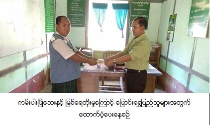စစ်ကိုင်းတိုင်းဒေသကြီး၊ ကလေးခရိုင်၊ ကလေးဝမြို့နယ်၊ နန်းဇလိန်ကျေးရွာ၌ (၄- ၇-၂၀၁၇) နေ့တွင် ချင်းတွင်းမြစ် ကမ်းပါးပြိုကျမှုကြောင့် နေအိမ်(၁) လုံး၊ အိမ်ထောင်စု(၁)စု၊ လူဦးရေ(၁၀)ဦး ပြောင်းရွှေ့ခဲ့ရမှု အတွက် ကယ်ဆယ်ရေးပစ္စည်း(၅)မျိုးနှင့်အတူ အိမ်ဆောက်ပစ္စည်းဖိုးငွေ(၁၀၀၀၀၀) အား ကလေးခရိုင်ဦးစီးမှုးရုံးမှ တာဝန်ရှိသူများသည် (၇-၇-၂၀၁၇) နေ့တွင် ကလေးဝမြို့နယ်ထွေ/အုပ်ရုံးသို့ သွားရောက််ခဲ့ပြီး ဒုမြို့နယ်အုပ်ချုပ်ရေးမှူးမှှတဆင့် လွှဲပြောင်းထောက်ပံပေးခဲ့ပြီး ကလေးဝမြို့နယ်၊ ဂဇက်ကျေးရွာ၊ အုန်းပင်စုကျေးရွာနှင့် ဆင်ခေါင်းကျေးရွာတို့၌ ချင်းတွင်းမြစ်ရေမြင့်တက်မှုကြောင့် (၆- ၇- ၂၀၁၇) နေ့တွင် အိမ်ခြေ (၈) လုံး၊ အိမ်ထောင်စု (၈) စု၊ လူဦးရေ (၃၅) ဦးတို့သည် နီးစပ်ရာဆွေမျိုးသားချင်း နေအိမ်များထံ ရွှေ့ပြောင်းခဲ့မှုကြောင့် ဘေးသင့်ပြည်သူများအတွက် ကယ်ဆယ်ရေးပစ္စည်း (၅) မျိုး၊ (၈) အိမ်ထောင်စာနှင့် ဆန်ရိက္ခာဖိုးငွေ (၇၃၅၀၀) ကျပ်အား (၇-၇-၂၀၁၇) နေ့တွင် ကလေးခရိုင်ဦးစီးမှူးရုံး တာဝန်ရှိသူများမှ ကလေးဝမြို့နယ်၊ ဒုမြို့နယ်အုပ်ချုပ်ရေးမှူးထံမှတဆင့် အသီးသီးထောက်ပံ့ပေးခဲ့ကြောင်း သတင်းရရှိပါသည်။