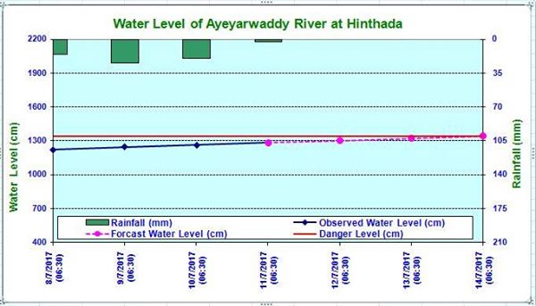 ယနေ့မြန်မာစံတော်ချိန် (၁၀:၃၀)နာရီအချိန် တိုင်းထွာချက်အရ ဧရာဝတီမြစ်ရေသည် ဟင်္သာတမြို့တွင် ယင်းမြို့၏ စိုးရိမ်ရေမှတ်အောက် (၂)ပေခန့်တွင် ရောက်ရှိနေပါသည်။ အဆိုပါ မြစ်ရေသည် နောက် (၃)ရက်အတွင်း ယင်းမြို့၏ စိုးရိမ်ရေမှတ်သို့ ရောက်ရှိနိုင်ပါသည်။