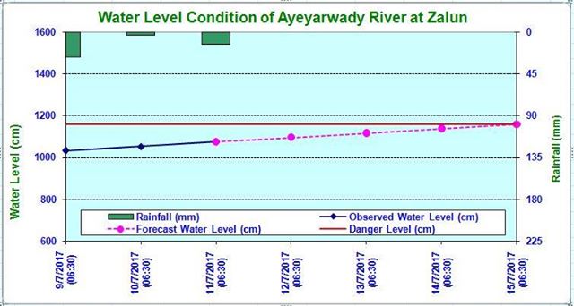 ယနေ့မြန်မာစံတော်ချိန် (၁၀:၃၀)နာရီအချိန် တိုင်းထွာချက်အရ ဧရာဝတီမြစ်ရေသည် ဇလွန်မြို့တွင် ယင်းမြို့၏ စိုးရိမ်ရေမှတ်အောက် (၂)ပေခွဲခန့်တွင် ရောက်ရှိနေပါသည်။ အဆိုပါ မြစ်ရေသည် နောက် (၄)ရက်အတွင်း ယင်းမြို့၏ စိုးရိမ်ရေမှတ်သို့ ရောက်ရှိနိုင်ပါသည်။
