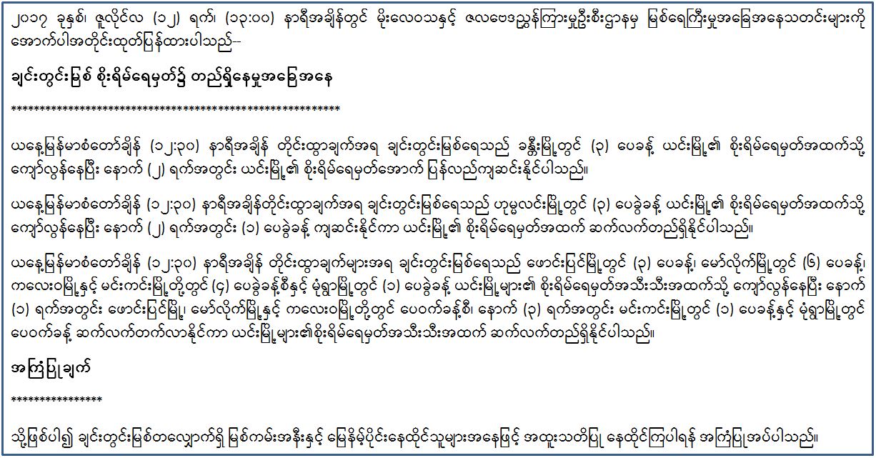 ၂၀၁၇ ခုနှစ်၊ ဇူလိုင်လ (၁၂) ရက်၊ (၁၃:၀၀) နာရီအချိန်တွင် မိုးလေဝသနှင့် ဇလဗေဒညွှန်ကြားမှုဦးစီးဌာနမှ မြစ်ရေကြီးမှုအခြေအနေသတင်းများကို အောက်ပါအတိုင်းထုတ်ပြန်ထားပါသည်–