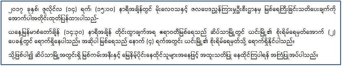 ၂၀၁၇ ခုနှစ်၊ ဇူလိုင်လ (၁၄) ရက်၊ (၁၅:၀၀) နာရီအချိန်တွင် မိုးလေဝသနှင့် ဇလဗေဒညွှန်ကြားမှုဦးစီးဌာနမှ မြစ်ရေကြီးခြင်းသတိပေးချက်ကို အောက်ပါအတိုင်းထုတ်ပြန်ထားပါသည်-