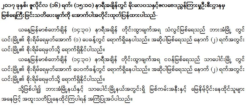၂၀၁၇ ခုနှစ်၊ ဇူလိုင်လ (၁၆) ရက်၊ (၁၅:၀၀) နာရီအချိန်တွင် မိုးလေဝသနှင့်ဇလဗေဒညွှန်ကြားမှုဦးစီးဌာနမှ မြစ်ရေကြီးခြင်းသတိပေးချက်ကို အောက်ပါအတိုင်းထုတ်ပြန်ထားပါသည်-