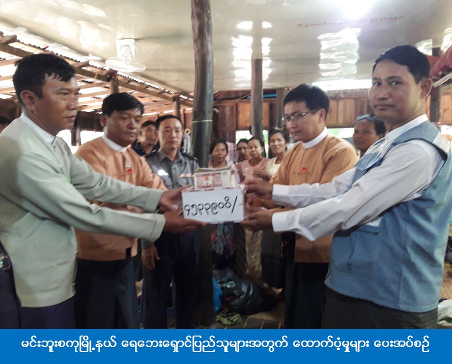 လူမှုဝန်ထမ်း၊ ကယ်ဆယ်ရေးနှင့် ပြန်လည်နေရာချထားရေးဝန်ကြီးဌာန၊ ကယ်ဆယ်ရေးနှင့် ပြန်လည်နေရာချထားရေးဦးစီးဌာန၊ မကွေးတိုင်းဒေသကြီးဦးစီးမှူးရုံးမှ တာဝန်ရှိသူများသည် မင်းဘူးစကုမြို့နယ်၌ ဧရာဝတီမြစ်ရေမြင့်တက်၍ ဘေးလွတ်ကင်းရာသို့ (၁၅-၇-၂၀၁၇) ရက်နေ့ထိ ရွှေ့ပြောင်းပြီးဖြစ်သော အိမ်ထောင်စု (၅၈၃) စု၊ လူဦးရေ (၂၁၅၉) ဦးတို့အတွက် ဆန် (၇) ရက်စာဖိုး (၄၅၃၃၉၀၀) ကျပ်တိတိကို တိုင်းဒေသကြီးအစိုးရအဖွဲ့၊ အလုပ်သမားလူဝင်မှုကြီးကြပ်ရေးနှင့် ပြည်သူ့အင်အားဝန်ကြီး ဦးနေမျိုးကျော်၊ တိုင်းဒေသကြီးလွှတ်တော်ကိုယ်စားလှယ်တို့နှင့်အတူ (၁၇-၇-၂၀၁၇) ရက်နေ့တွင် သွားရောက်ထောက်ပ့ံခဲ့ကြောင်း သိရှိရပါသည်။