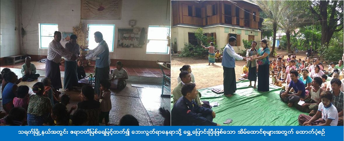 ကယ်ဆယ်ရေးနှင့် ပြန်လည်နေရာချထားရေးဦးစီးဌာန၊ သရက်ခရိုင်ဦးစီးမှူးရုံးမှ တာဝန်ရှိသူများသည် သရက်မြို့နယ်အတွင်း ဧရာဝတီမြစ်ရေမြင့်တက်၍ ဘေးလွတ်ရာနေရာသို့ (၁၇-၇-၂၀၁၇) ရက်နေ့ထိ ရွှေ့ပြောင်းပြီးဖြစ်သော အိမ်ထောင်စု (၁၉၄) စု၊ လူဦးရေ (၇၄၄) ဦးတို့အတွက် ဆန်(၇)ရက်စာဖိုးငွေ (၁၅၆၂၄၀၀) ကျပ်တိတိကို သရက်မြို့နယ်အထွေထွေအုပ်ချုပ်ရေးဦးစီးဌာန၊ မြို့နယ်မီးသတ်ဦးစီးဌာနတို့မှ တာဝန်ရှိသူများနှင့်အတူ (၁၈-၇-၂၀၁၇) ရက်နေ့တွင် သွားရောက်ထောက်ပ့ံခဲ့ကြောင်း သိရှိရပါသည်။