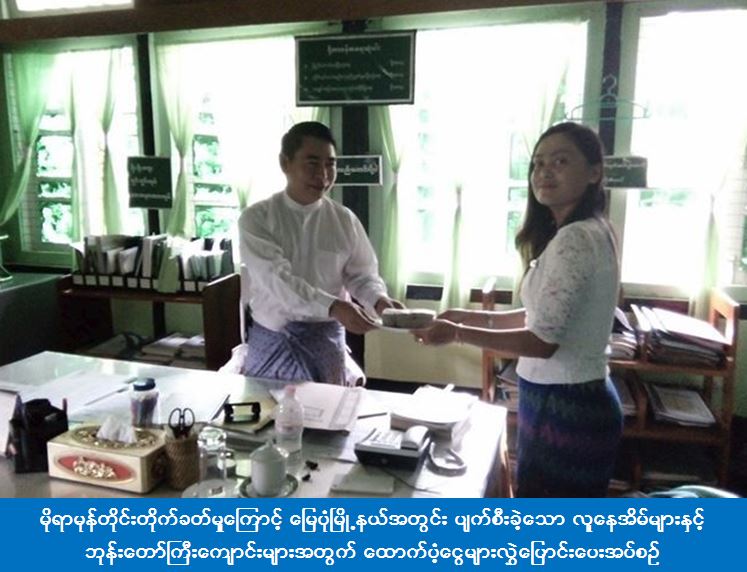 (၃၀-၅-၂၀၁၇) ရက်နေ့တွင် မိုရာမုန်တိုင်းတိုက်ခတ်မှုကြောင့် မြေပုံမြို့နယ်အတွင်း တစ်စိတ်တစ်ပိုင်းပျက်စီးသွားသော (သွပ်မိုး/ပျဉ်ကာ) လူနေအိမ် (၁၄) လုံး၊ လုံးဝပျက်စီးသွားသော (ဓနိမိုး/ထရံကာ) လူနေအိမ် (၁၅) လုံး၊ တစ်စိတ်တစ်ပိုင်းပျက်စီးသွားသော (ဓနိမိုး/ထရံကာ) လူနေအိမ် (၁၄) လုံး၊ တစ်စိတ်တစ်ပိုင်းပျက်စီးသွားသော (သွပ်မိုး/ပျဉ်ကာ) ဘုန်းတော်ကြီးကျောင်း (၆) ကျောင်းအတွက် စုစုပေါင်းထောက်ပံ့ငွေ(၃၀၈၀၀၀၀ိ) ကျပ်တိတိအား (၁၈-၇-၂၀၁၇) ရက်နေ့တွင် မြေပုံမြို့နယ်အုပ်ချုပ်ရေးမှူးထံ လွှဲပြောင်းထောက်ပံ့ပေးခဲ့ကြောင်း သိရှိရပါသည်။
