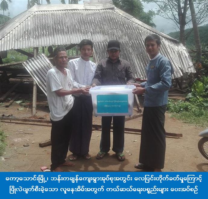 (၁၇-၇-၂၀၁၇) ရက်နေ့တွင် ကော့သောင်းမြို့၊ ချမ်းဖန်ကျေးရွာအုပ်စုအတွင်း လေပြင်းတိုက်ခတ်မှုကြောင့် အမိုးလန်ပျက်စီးခဲ့သော အိမ်ထောင်စု (၄) စုအတွက် ကယ်ဆယ်ရေးပစ္စည်း (၄) မျိုး (၄) အိမ်ထောင်စာကို ကျေးရွာအုပ်ချုပ်ရေးမှူးထံလည်းကောင်း၊