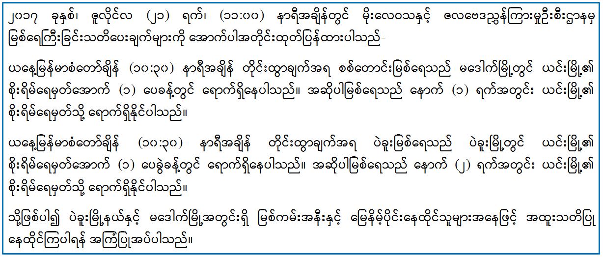 ၂၀၁၇ ခုနှစ်၊ ဇူလိုင်လ (၂၁) ရက်၊ (၁၁:၀၀) နာရီအချိန်တွင် မိုးလေဝသနှင့် ဇလဗေဒညွှန်ကြားမှုဦးစီးဌာနမှ မြစ်ရေကြီးခြင်းသတိပေးချက်များကို အောက်ပါအတိုင်းထုတ်ပြန်ထားပါသည်-