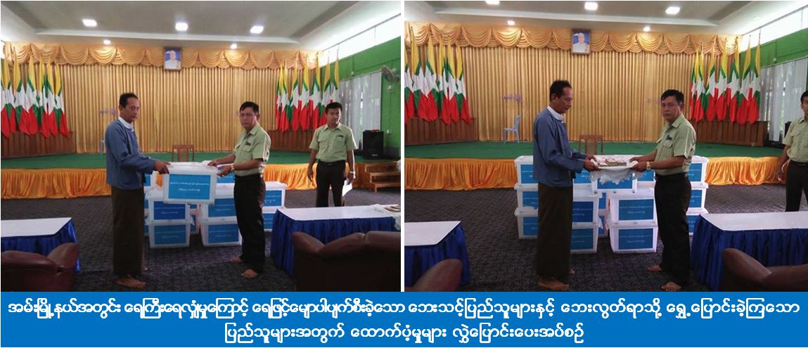 အမ်းမြို့နယ်အတွင်း ဖြစ်ပွားခဲ့သော ရေကြီးရေလျှံမှုကြောင့် ရေဖြင့်မျောပါပျက်စီးခဲ့သော အိမ်ခြေ (၁၇) အိမ်အတွက် အိမ်ဆောက်ပစ္စည်းဖိုးငွေ (၁၇၀၀၀၀၀) ကျပ်၊ ဘေးသင့်လူဦးရေ (၇၃) ဦးအတွက် ဆန်ရိက္ခာဖိုးငွေ (၁၅၃၃၀၀) ကျပ်နှင့် ကယ်ဆယ်ရေးပစ္စည်း (၁၀) မျိုး (၁၇) အိမ်ထောင်စာတို့ကိုလည်းကောင်း၊