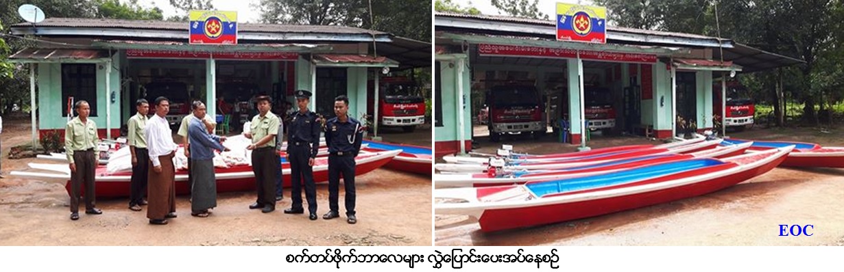 မွန်ပြည်နယ်အစိုးရအဖွဲ့မှ အမျိုးသားသဘာဝဘေးရန်ပုံငွေအထောက်အပံ့ဖြင့် ဝယ်ယူခဲ့သည့် စက်တပ်ဖိုက်ဘာလှေ (၅) စီးနှင့် အသက် ကယ်အင်္ကျီ (၅၀) ထည်တို့အား သဘာဝဘေးအန္တရယ်ကြိုတင်ကာကွယ်ရေးနှင့် အလျင်အမြန်တုံ့ပြန်ဆောင်ရွက်ရေးတို့အတွက် မွန်ပြည်နယ် သဘာဝဘေးအန္တရာယ်စီမံခန့်ခွဲရေးကော်မတီအဖွဲ့ကိုယ်စား တွဲဖက်အတွင်းရေးမှူး ကယ်ဆယ်ရေးနှင့်ပြန်လည်နေရာချထားရေးဦးစီးဌာန၊ မွန် ပြည်နယ်ဦးစီးမှူး ဦးသောင်းရွှေမှ ဘီးလင်းမြို့နယ် သဘာဝဘေးစီမံခန့်ခွဲမှုကော်မတီသို့ (၂၈-၇-၂၀၁၇) ရက်နေ့ နံနက် (၀၉း၁၅) နာရီအချိန်တွင် လွှဲပြောင်းပေးအပ်ခဲ့ကြောင်း သတင်းရရှိပါသည်။