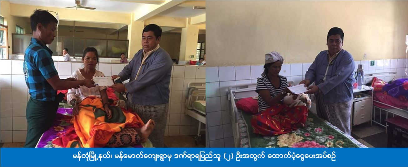 (၂၀-၇-၂၀၁၇) ရက်နေ့တွင် မန်တုံမြို့နယ်၊ မန်မောက်ကျေးရွာ၌ TNLA သကလတစ်ဖွဲ့လျှင် (၄၀) ဦးခန့်ပါ (၂)ဖွဲ့နှင့် မန်တုံအခြေစိုက် နဗဟ (၃) လက်အောက်ခံ (စမရ-၅၀၄)နှင့် ခလရ (၁၇) စစ်ကြောင်းများ ထိတွေ့မှုကြောင့် မန်မောက်ကျေးရွာမှ ဒေါ်အေးဟိန်း အသက် (၃၀) နှစ် (ဘ)ဦးပေါ်ဟိန်း ကျည်ဆံထိမှန်နှင့် ဒေါ်မယ်အိဂန် အသက် (၅၀) နှစ် (ဘ)ဦးထန်းမောင် လက်နက်ကြီးထိမှန်တို့ (၂) ဦးဒဏ်ရာရရှိခဲ့ပြီး လားရှိုးမြို့ ပြည်သူ့ဆေးရုံကြီးတွင် ဆေးကုသမှုခံယူလျှက်ရှိရာ အဆိုပါဒဏ်ရာရပြည်သူ (၂) ဦးအတွက် (၁) ဦးလျှင် ထောက်ပံ့ငွေ (၅၀၀၀၀) ကျပ်နှုန်းဖြင့် (၁၀၀၀၀၀) ကျပ်တိတိအား (၂၈-၇-၂၀၁၇) ရက်နေ့တွင် ကယ်ဆယ်ရေးနှင့် ပြန်လည်နေရာချထားရေးဦးစီးဌာန၊ လားရှိုးခရိုင်ဦးစီးမှူးရုံးမှ တာဝန်ရှိသူများသည် သွားရောက်ထောက်ပံ့ပေးခဲ့ကြောင်း သိရှိရပါသည်။
