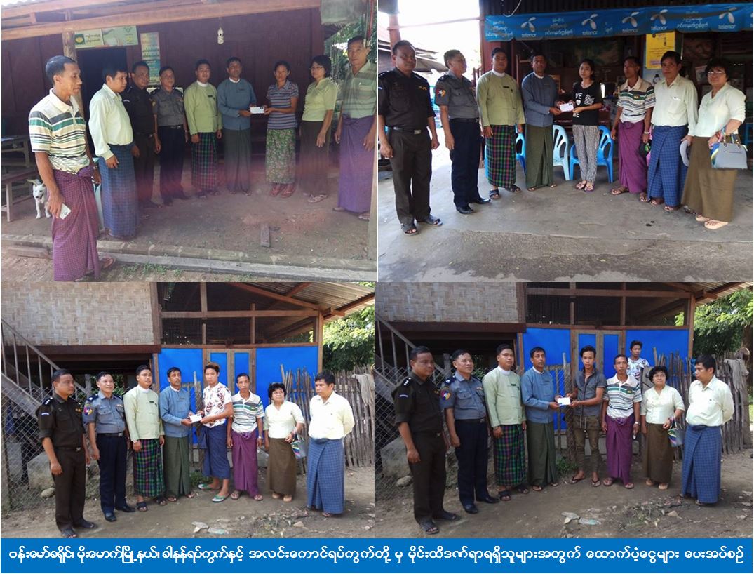 ဗန်းမော်ခရိုင်ဦးစီးမှူးရုံး (ကဆရ) မှ တာဝန်ရှိသူများသည် (၂၈-၇-၂၀၁၇) ရက်နေ့တွင် ဗန်းမော်ခရိုင်၊ မိုးမောက်မြို့နယ်အတွင်း မိုင်းထိဒဏ်ရာရရှ်ိသူ ခါနန်ရပ်ကွက်မှ (၁) ဦးနှင့် အလင်းကောင်ရပ်ကွက်မှ (၃) ဦး စုစုပေါင်း(၄)ဦးတို့အား တစ်ဦးလျှင် ထောက်ပံ့ငွေ (၅၀၀၀၀) ကျပ်နှုန်းဖြင့် ထောက်ပံ့ငွေစုစုပေါင်းငွေ (၂၀၀၀၀၀) ကျပ်တိတိတို့ကို သွားရောက်ထောက်ပ့ံခဲ့ကြောင်း သိရှိရပါသည်။