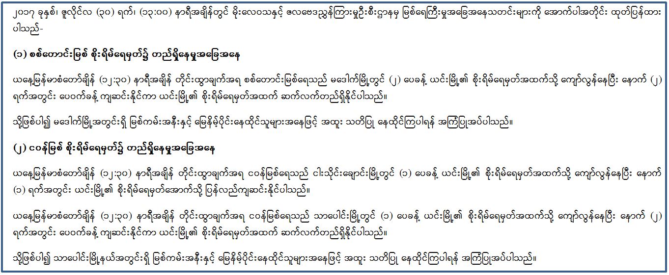 ၂၀၁၇ ခုနှစ်၊ ဇူလိုင်လ (၃၀) ရက်၊ (၁၃:၀၀) နာရီအချိန်တွင် မိုးလေဝသနှင့် ဇလဗေဒညွှန်ကြားမှုဦးစီးဌာနမှ မြစ်ရေကြီးမှုအခြေအနေသတင်းများကို အောက်ပါအတိုင်း ထုတ်ပြန်ထားပါသည်-