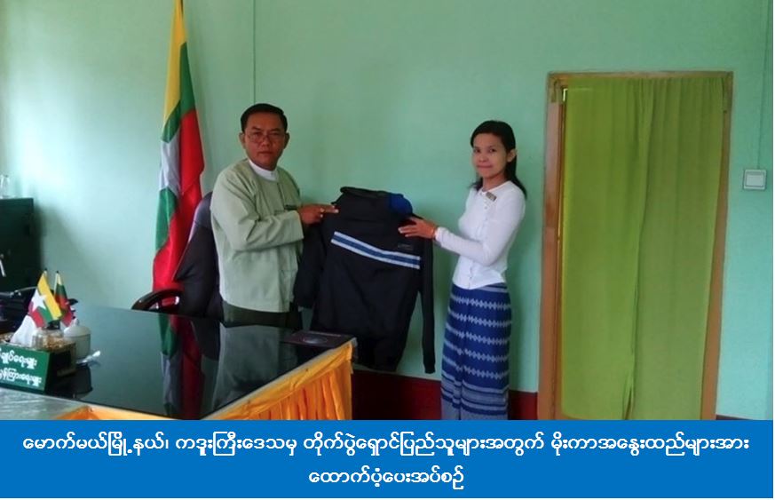 (၁-၈-၂၀၁၇) ရက်နေ့တွင် ရှမ်းပြည်နယ်ဦးစီးမှူးရုံး (ကဆရ) မှ တာဝန်ရှိသူများသည် ဟာဂျူလီကုမ္ပဏီ (ရန်ကုန်မြို့) မှ ရှမ်းပြည်နယ်အတွင်းရှိ တိုက်ပွဲရှောင်ပြည်သူများအတွက် လှူဒါန်းထားသော မိုးကာအနွေးထည် (၁၀၀) ထည်အား မောက်မယ်မြို့နယ်၊ ကဒူးကြီးဒေသမှ တိုက်ပွဲရှောင်ပြည်သူများအတွက် ဆီဆိုင်မြို့နယ်အထွေထွေအုပ်ချုပ်ရေးဦးစီးဌာနမှတစ်ဆင့် ပေးပို့ထောက်ပံ့ပေးအပ်ခဲ့ကြောင်း သိရှိရပါသည်။