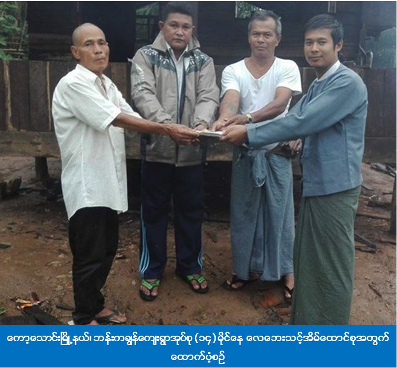 (၁၇-၇-၂၀၁၇) ရက်နေ့တွင် ကော့သောင်းမြို့နယ်၊ ဘန်းကချွန်းကျေးရွာအုပ်စု (၁၄) မိုင်၌ မိုးသည်းထန်စွာရွာသွန်း၍ လေပြင်းတိုက်ခတ်မှုကြောင့် နေအိမ် (၁) လုံးပြိုလဲပျက်စီးခဲ့ရာ အဆိုပါနေအိမ် (၁) လုံးအတွက် အိမ်ဆောက်ပစ္စည်းဖိုးငွေ (၂) သိန်းကျပ်နှင့် ဆန်ရိက္ခာဖိုးငွေ (၁၂၆၀၀) ကျပ် ထောက်ပံ့ငွေစုစုပေါင်း (၂၁၂၆၀၀) ကျပ်တိတိအား ကော့သောင်းခရိုင်ဦးစီးမှူးရုံး (ကဆရ) မှ တာဝန်ရှိသူများသည် ဘန်းကချွန်ကျေးရွာအုပ်ချုပ်ရေးမှူးနှင့်အတူ (၃၁-၇-၂၀၁၇) ရက်နေ့၊ (၁၈းဝ၀) နာရီအချိန်တွင် သွားရောက်ထောက်ပံ့ခဲ့ကြောင်း သိရှိရပါသည်။