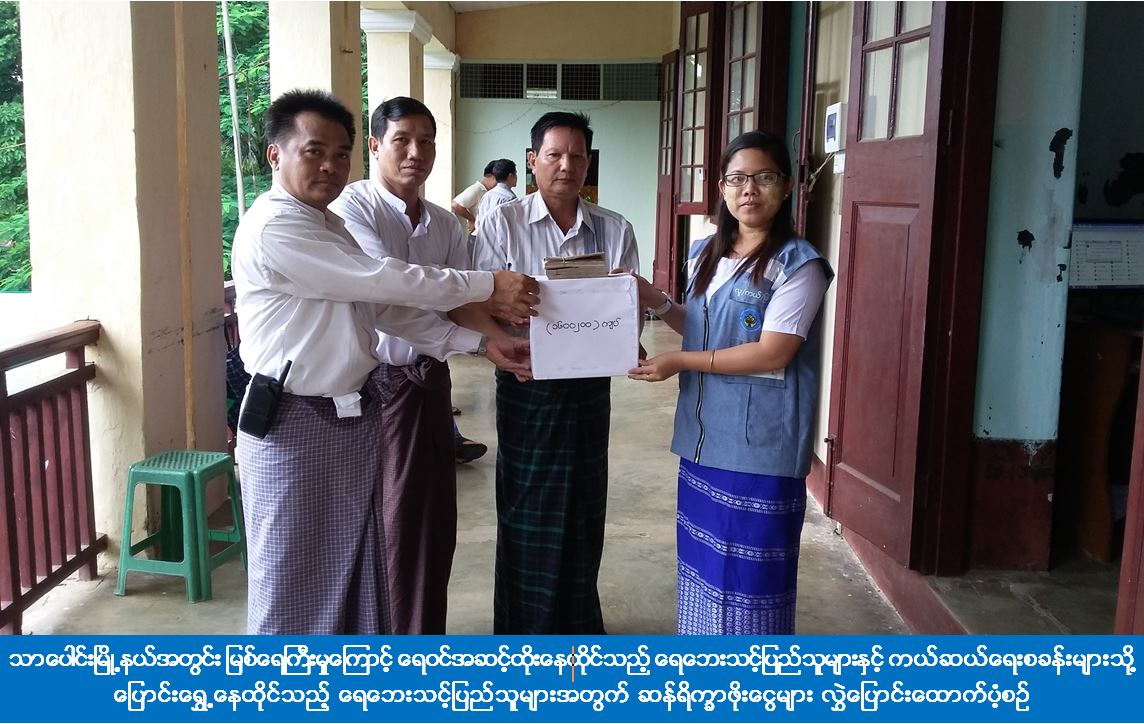ကယ်ဆယ်ရေးနှင့် ပြန်လည်နေရာချထားရေးဦးစီးဌာန၊ ဧရာဝတီတိုင်းဒေသကြီးဦးစီးမှူးရုံးမှ တာဝန်ရှိသူများသည် သာပေါင်းမြို့နယ်အတွင်း မြစ်ရေကြီးမှုကြောင့် ရေဝင်အဆင့်ထိုးနေထိုင်သည့် ရေဘေးသင့်ပြည်သူများနှင့် ကယ်ဆယ်ရေးစခန်းများသို့ပြောင်းရွှေ့နေထိုင်သည့် ရေဘေးသင့်ပြည်သူ (၇၆၂) ဦးအတွက် ဆန်ရိက္ခာ(၇)ရက်စာ (၁၆၀၀၂၀၀) ကျပ်အား (၃-၈-၂၀၁၇) ရက်နေ့တွင် သာပေါင်းမြို့နယ်သဘာဝဘေးအန္တရာယ်ဆိုင်ရာစီမံခန့်ခွဲမှုအဖွဲ့ထံသို့ လွှဲပြောင်းထောက်ပံ့ပေးအပ်ခဲ့ကြောင်း သိရှိရပါသည်။