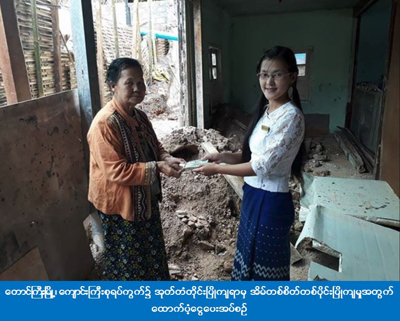 (၂၇-၇-၂၀၁၇) ရက်နေ့တွင် တောင်ကြီးမြို့၊ ကျောင်းကြီးစုရပ်ကွက်၊ အိမ်အမှတ် (ဟတ/၉) ၌ အုတ်တံတိုင်းပြိုကျရာမှ အိမ်တစ်စိတ်တစ်ပိုင်းပြိုကျခဲ့ရာ အဆိုပါပြိုကျမှုအတွက် ကယ်ဆယ်ရေးနှင့် ပြန်လည်နေရာချထားရေးဦးစီးဌာန၊ ရှမ်းပြည်နယ်ဦးစီးမှူးရုံးမှ တာဝန်ရှိသူများသည် (၇-၈-၂၀၁၇) ရက်နေ့တွင် ထောက်ပံ့ငွေ (၁၀၀,၀၀၀) ကျပ်အား သွားရောက်ထောက်ပံ့ပေးအပ်ခဲ့ကြောင်း သိရှိရပါသည်။