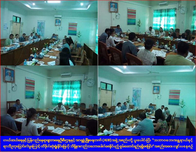 ၁။ လူမှုဝန်ထမ်း၊ ကယ်ဆယ်ရေးနှင့် ပြန်လည်နေရာချထားရေးဝန်ကြီးဌာန၊ ကယ်ဆယ်ရေးနှင့််ပြန်လည်နေရာချထားရေးဦးစီးဌာနနှင့် အာရှဖွံ့ဖြိုးရေးဘဏ် (ADB ) အဖွဲ့အစည်းတို့ ပူးပေါင်းပြီး မြန်မာနိုင်ငံ ပြည်သူလူထု၏ သဘာဝဘေးအန္တရာယ်နှင့် ရာသီဥတုပြောင်းလဲမှုကြောင့် ထိခိုက်ဆုံးရှုံးနိုင်ခြေလျော့ပါးရေးအတွက် နည်းပညာပံ့ပိုးမှုစီမံချက်လုပ်ငန်း၏ Output (1)နှင့် စပ်လျဉ်းသည့် “သဘာဝဘေးအန္တရာယ်နှင့် ရာသီဥတုပြောင်းလဲမှုကြောင့် ထိခိုက်ဆုံးရှုံးနိုင်ခြေကို သိရှိနားလည်သဘောပေါက်စေနိုင်မည့် စွမ်းဆောင်ရည်ရရှိစေခြင်း” အစည်းအဝေးကို (၇-၈-၂၀၁၇)ရက်နေ့၊ (၁၀:၀၀)နာရီတွင် ကယ်ဆယ်ရေးနှင့် ပြန်လည် နေရာချထားရေးဦးစီးဌာန၊ အရေးပေါ်အခြေအနေစီမံခန့်ခွဲမှှုဗဟိုဌာန (EOC) အဆောက် အအုံအသစ်တွင် ကျင်းပပြုလုပ်ခဲ့ရာ အဆိုပါအစည်းအဝေးသို့ ကယ်ဆယ်ရေးနှင့် ပြန်လည်နေရာချထားရေးဦးစီးဌာနမှ ညွှန်ကြားရေးမှူးချုပ်နှင့်တကွ ညွှန်ကြားရေးမှူးများ၊ ဒုတိယညွှန်ကြားရေးမှူးများ၊ မိုးလေဝသနှင့်ဇလဗေဒညွှန်ကြားမှုဦးစီးဌာနနှင့် ပတ်ဝန်းကျင် ထိန်းသိမ်းရေးဦးစီးဌာနတို့မှ ညွှန်ကြားရေးမှူးများနှင့် ADB အဖွဲ့အစည်းမှ ကိုယ်စားလှယ်များ စုစုပေါင်း (၂၀)ဦးခန့် တက်ရောက်ခဲ့ပါသည်။