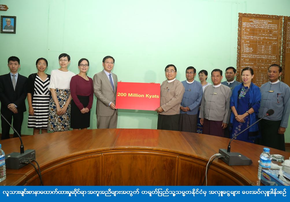 မြန်မာနိုင်ငံအတွင်း လူသားချင်းစာနာထောက်ထားမှုဆိုင်ရာ အကူအညီများအတွက် တရုတ်ပြည်သူ့သမ္မတနိုင်ငံမှလှူဒါန်းသော အလှူငွေ ကျပ်သန်း (၂၀၀) ကို မြန်မာနိုင်ငံဆိုင်ရာ တရုတ်ပြည်သူ့သမ္မတနိုင်ငံ၊ သံအမတ်ကြီး H.E Mr. Hong Liang က (၉-၈-၂၀၁၇) ရက်နေ့၊ နံနက် (၀၉းဝဝ) အချိန်တွင် နေပြည်တော်ရှိ လူမှုဝန်ထမ်း၊ ကယ်ဆယ်ရေးနှင့် ပြန်လည်နေရာချထားရေးဝန်ကြီးဌာနတွင် လာရောက်ပေးအပ်လှူဒါန်းရာ အမျိုးသားသဘာဝဘေးအန္တရာယ်ဆိုင်ရာ စီမံခန့်ခွဲမှုကော်မတီ၊ ဒုတိယဥက္ကဌ၊ လူမှုဝန်ထမ်း၊ ကယ်ဆယ်ရေးနှင့် ပြန်လည်နေရာချထားရေးဝန်ကြီးဌာန၊ ပြည်ထောင်စုဝန်ကြီး ဒေါက်တာဝင်းမြတ်အေး က လက်ခံရယူပြီး ဂုဏ်ပြုမှတ်တမ်းလွှာ ပြန်လည်ပေးအပ်ခဲ့ကြောင်း သိရှိရပါသည်။