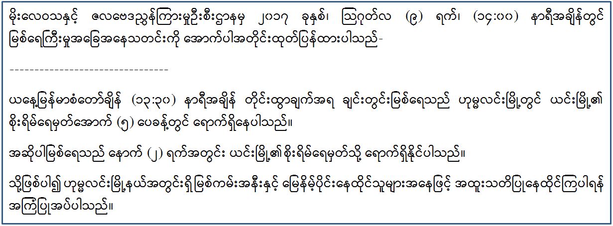 မိုးလေဝသနှင့် ဇလဗေဒညွှန်ကြားမှုဦးစီးဌာနမှ ၂၀၁၇ ခုနှစ်၊ သြဂုတ်လ (၉) ရက်၊ (၁၄:၀၀) နာရီအချိန်တွင် မြစ်ရေကြီးမှုအခြေအနေသတင်းကို အောက်ပါအတိုင်းထုတ်ပြန်ထားပါသည်-