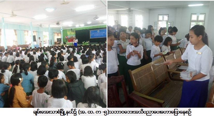လူမှုဝန်ထမ်း၊ကယ်ဆယ်ရေးနှင့်ပြန်လည်နေရာချထားရေးဝန်ကြီးဌာန၊ကယ်ဆယ်ရေးနှင့်ပြန်လည်နေ ရာချထားရေးဦးစီးဌာန၊ မန္တလေးတိုင်းဒေသကြီးဦးစီးမှူးရုံးမှတာဝန်ရှိသူများသည် (၉-၈-၂၀၁၇)နေ့တွင် ချမ်းအေးသာစံမြို့နယ် (အ.ထ.က-၂) ကျောင်း၌ ကျောင်းသားကျောင်းသူ အင်အား (၃၀၀)ဦးနှင့် (အ.ထ.က-၅) ကျောင်း၌ ကျောင်းသားကျောင်းသူ အင်အား (၂၅၀)ဦးတို့အား သဘာဝဘေး အသိပညာပေးဟောပြောခြင်း၊ သရုပ်ပြကဒ်ပြားများဖြင့် ပညာပေးကစားခြင်း၊ လက်ကမ်းစာစောင် ပိုစတာများဝေငှခြင်းတို့ဆောင်ရွက်ခဲ့ကြောင်းသတင်းရရှိပါသည်။Source: မန္တလေးတိုင်းဒေသကြီးဦးစီးမှူးရုံး (ကဆရ)