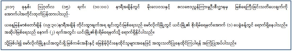 ၂၀၁၇ ခုနှစ်၊ သြဂုတ်လ (၁၅) ရက်၊ (၁၀:၀၀) နာရီအချိန်တွင် မိုးလေဝသနှင့် ဇလဗေဒညွှန်ကြားမှုဦးစီးဌာနမှ မြစ်ရေကြီးခြင်းသတိပေးချက်ကို အောက်ပါအတိုင်းထုတ်ပြန်ထားပါသည်-