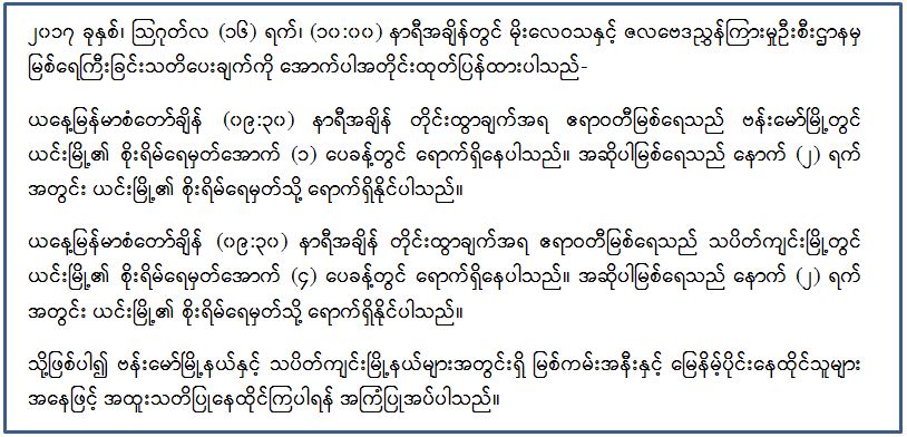 ၂၀၁၇ ခုနှစ်၊ သြဂုတ်လ (၁၆) ရက်၊ (၁၀:၀၀) နာရီအချိန်တွင် မိုးလေဝသနှင့် ဇလဗေဒညွှန်ကြားမှုဦးစီးဌာနမှ မြစ်ရေကြီးခြင်းသတိပေးချက်ကို အောက်ပါအတိုင်းထုတ်ပြန်ထားပါသည်-