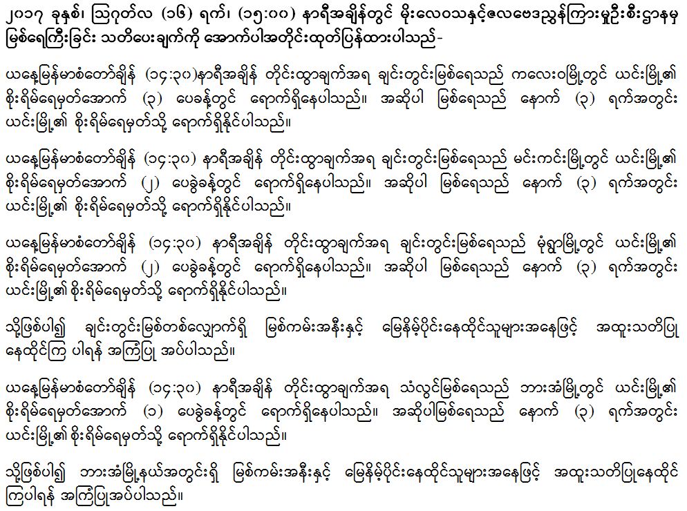 ၂၀၁၇ ခုနှစ်၊ သြဂုတ်လ (၁၆) ရက်၊ (၁၅:၀၀) နာရီအချိန်တွင် မိုးလေဝသနှင့်ဇလဗေဒညွှန်ကြားမှုဦးစီးဌာနမှ မြစ်ရေကြီးခြင်း သတိပေးချက်ကို အောက်ပါအတိုင်းထုတ်ပြန်ထားပါသည်-