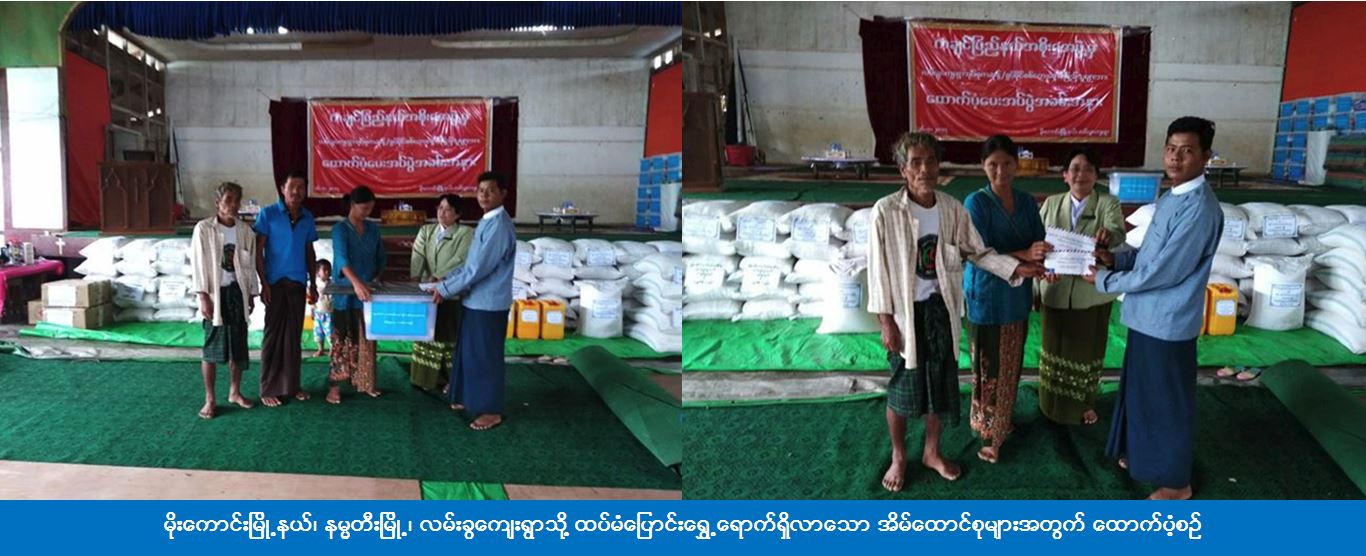 (၁၆-၈-၂၀၁၇) ရက်နေ့တွင် မိုးကောင်းမြို့နယ်၊ နမ္မတီးမြို့၊ လမ်းခွကျေးရွာသို့ ထပ်မံပြောင်းရွှေ့ရောက်ရှိလာသော အိမ်ထောင်စု (၈၁) စု၊ လူဦးရေ (၃၃၇) ဦးအတွက် ကယ်ဆယ်ရေးပစ္စည်း (၁၇) မျိုးပါ (၁၂) ပုံးနှင့် (၁၆) မျိုးပါ (၆၉) ပုံးနှင့် ဆန်ရိက္ခာဖိုငွေ (၇၀၇၇၀၀) ကျပ်တိတိအား ကယ်ဆယ်ရေးနှင့် ပြန်လည်နေရာချထားရေးဦးစီးဌာန၊ ကချင်ပြည်နယ်ဦးစီးမှူးနှင့် မိုးညှင်းခရိုင်ဦးစီးမှူးရုံးတို့မှ တာဝန်ရှိသူများသည် (၁၆-၈-၂၀၁၇) ရက်နေ့တွင် သွားရောက်ထောက်ပံ့ခဲ့ပြီးဖြစ်ပါကြောင်း သိရှိရပါသည်။