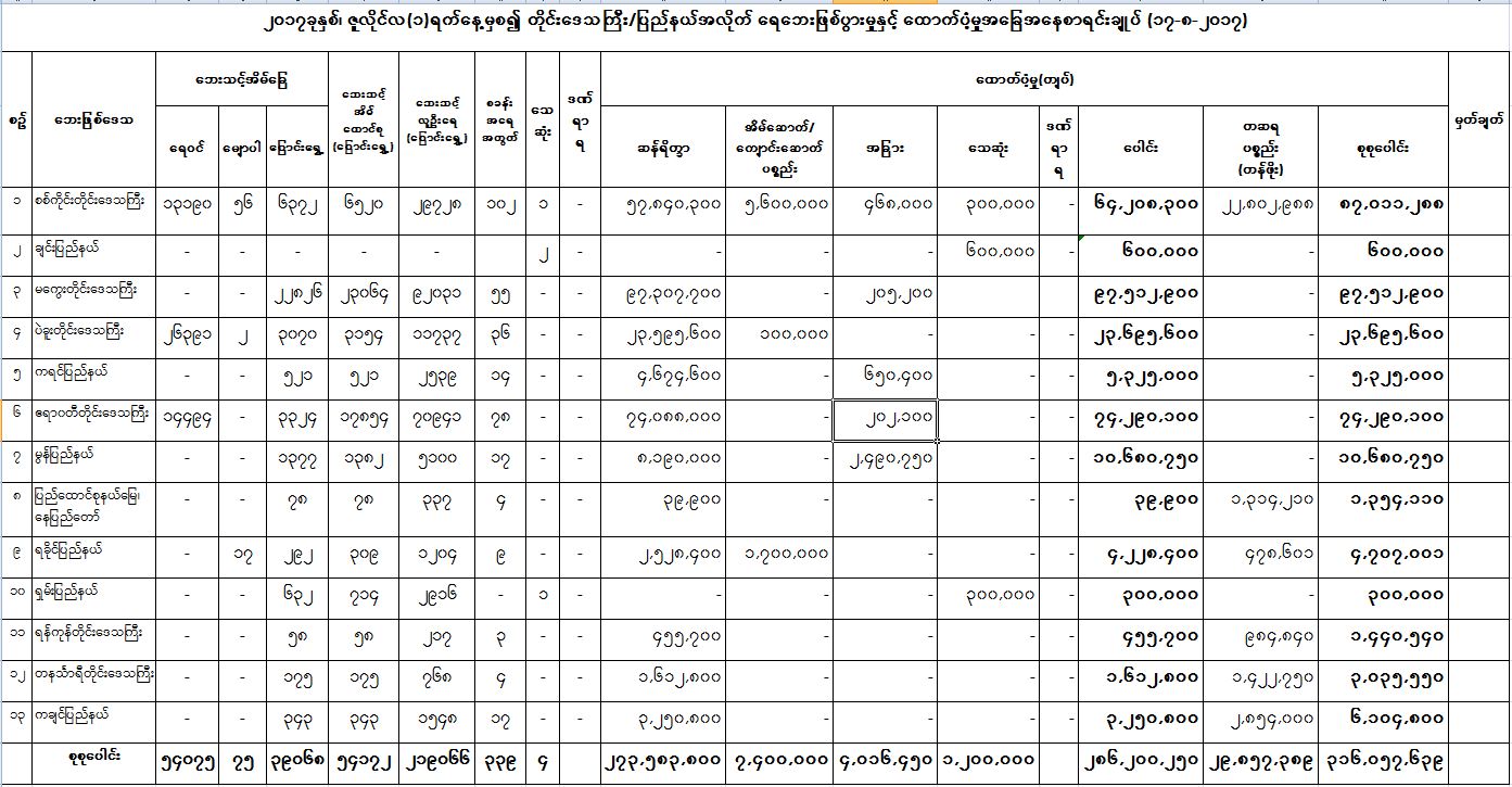 ၂၀၁၇ခုနှစ်၊ ဇူလိုင်လ(၁)ရက်နေ့မှစ၍ တိုင်းဒေသကြီး/ပြည်နယ်အလိုက် ရေဘေးဖြစ်ပွားမှုနှင့် ထောက်ပံ့မှုအခြေအနေစာရင်းချုပ် (၁၇-၈-၂၀၁၇)