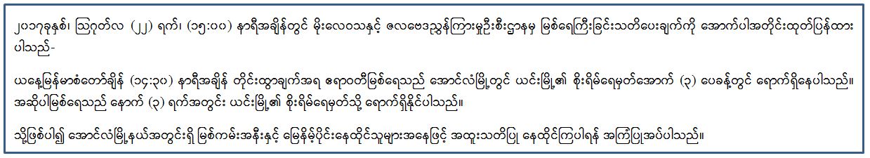 ၂၀၁၇ခုနှစ်၊ သြဂုတ်လ (၂၂) ရက်၊ (၁၅:၀၀) နာရီအချိန်တွင် မိုးလေဝသနှင့် ဇလဗေဒညွှန်ကြားမှုဦးစီးဌာနမှ မြစ်ရေကြီးခြင်းသတိပေးချက်ကို အောက်ပါအတိုင်းထုတ်ပြန်ထား ပါသည်-