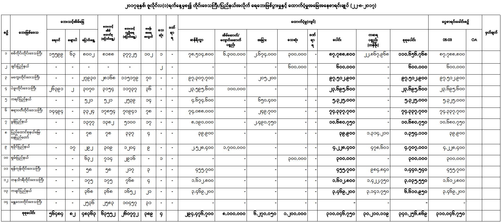 ၂၀၁၇ ခုနှစ်၊ ဇူလိုင်လ(၁) ရက်နေ့မှစ၍ တိုင်းဒေသကြီး/ပြည်နယ်အလိုက် ရေဘေးဖြစ်ပွားမှုနှင့် ထောက်ပံ့မှုအခြေအနေစာရင်းချုပ် (၂၂-၈-၂၀၁၇)