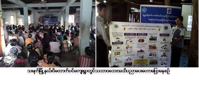 လူမှုဝန်ထမ်း၊ ကယ်ဆယ်ရေးနှင့်ပြန်လည်နေရာချထားရေးဝန်ကြီးဌာန၊ ကယ်ဆယ်ရေးနှင့်ပြန်လည်နေ ရာချထားရေးဦးစီးဌာန၊ သရက်ခရိုင်ဦးစီးမှူးရုံးမှတာဝန်ရှိသူများသည် (၂၃-၈-၂၀၁၇) နေ့တွင် သရက်မြို့နယ်၊ ပိတောက်ပင်ကျေးရွာတွင် ကျေးရွာပြည်လူဦးရေ (၂၀၀)ဦးနှင့်(၂၄-၈-၂၀၁၇) နေ့တွင် သရက်မြို့နယ်၊ဘန်းကုန်းတွင်ကျေးရွာတွင် ကျေးရွာပြည်လူဦးရေ (၁၃၀)ဦးတို့အား သဘာဝဘေးလျော့ပါးရေအသိပညာပေးဟော ဆွေးနွေးခဲ့ပြီး အသိပညာပေးလက်ကမ်းစာစောင်များ မိုးကြိုးဘေးဗီနိုင်းပိုစတာများကို ဖြန့်ဝေပေးခဲ့ကြောင်းသတင်းရရှိပါ သည်။Source: သရက်ခရိုင်ဦးစီးမှူးရုံး (ကဆရ)