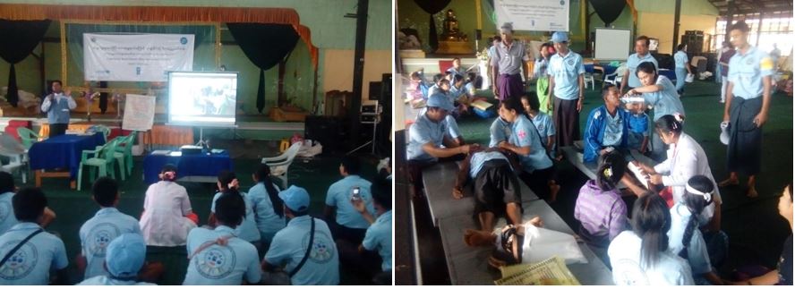 လူမှုဝန်ထမ်း၊ ကယ်ဆယ်ရေးနှင့်ပြန်လည်နေရာချထားရေးဝန်ကြီးဌာန၊ ကယ်ဆယ်ရေးနှင့်ပြန်လည်နေ ရာချထားရေးဦးစီးဌာန၊ ဖျာပုံခရိုင်ဦးစီးမှူးရုံးနှင့် UN Volunteers အဖွဲ့နှင့်ပူးပေါင်း၍ (၂၁.၈.၂၀၁၇ )မှ (၂၅.၈.၂၀၁၇)နေ့ထိ ရပ်ရွာလူထုအခြေပြု ဘေးအန္တရာယ်ကြောင့်ထိခိုက်ဆုံးရှုံးနိုင်ခြေ စီမံခန့့်ခွဲမှု သင်တန်းအား ဘိုကလေးမြို့မဟာအောင်တော်မူဘုရားဝင်းရှိ ချိူကြည်တန်ဆောင်း၌ ကျင့်ပခဲ့ပြီး သင်တန်းတွင် ဘေးအမျိုးအစားလိုက် ကြိုတင်ပြင်ဆင်ပြီး တုံ့ပြန်ဆောင်ရွက်မှုပိုမိုအားကောင်း စေရးနှင့် ရေရှည်ဖွံ့ဖြိုးတိုးတက်စေမည့် စနစ်ကျသောစီမံခန့်ခွဲရေးလုပ်ငန်းများအား ပြည်သူလူထုပူး ပေါင်းပါဝင်ခြင်း ဖြင့်် ဘေးဖြစ်နိုခြေများးအားလျော့နည်းသက်သာစေသည့် နည်းများ ဆွေးနွေးပို့ချခဲ့ပြီးမုန်တိုင်းသဏ္ဍာန်တူဇာတ်တိုက်လေ့ကျင့်ခြင်း Table top exercise ကိုလက်တွေ့သရုပ်ပြဆောင် ရွက်ခဲ့ပြီး DAN and Kobo Appး အကြောင်းလည်းရှင်းလင်းဆွေးနွေးခဲ့ကြောင်းသတင်းရရှိပါ သည်။Sourceး ဖျာပုံခရိုင်ဦးစီးမှူးရုံး (ကဆရ)