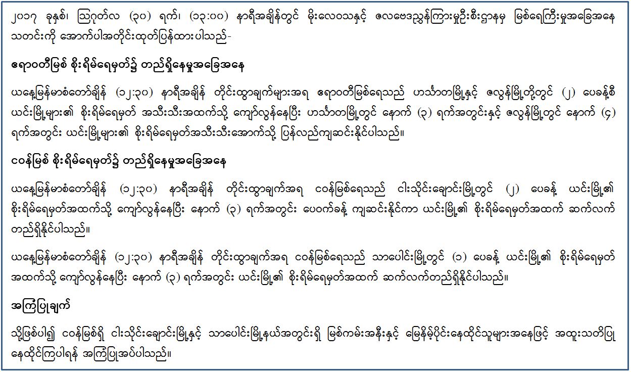 ၂၀၁၇ ခုနှစ်၊ သြဂုတ်လ (၃၀) ရက်၊ (၁၃:၀၀) နာရီအချိန်တွင် မိုးလေဝသနှင့် ဇလဗေဒညွှန်ကြားမှုဦးစီးဌာနမှ မြစ်ရေကြီးမှုအခြေအနေသတင်းကို အောက်ပါအတိုင်းထုတ်ပြန်ထားပါသည်-