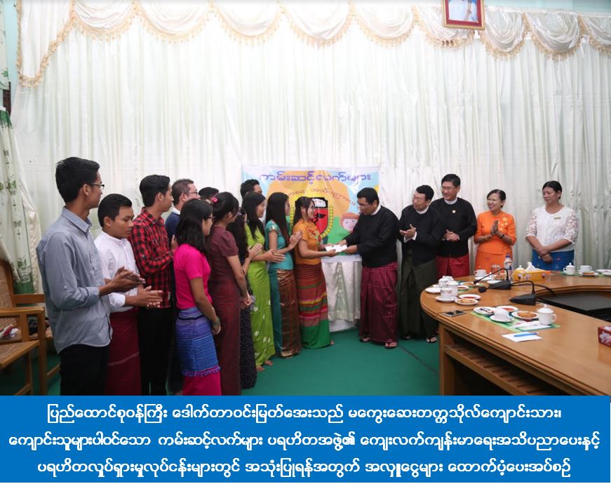 ပြည်ထောင်စုဝန်ကြီးက ယနေ့လူငယ်များကို အနာဂါတ်နိုင်ငံအတွက် လက်ဆင့်ကမ်း အမွေပေးရန်ဖြစ်သဖြင့် ယခုအချိန်ကတည်းက ပြည်သူများ၏လိုအပ်ချက်နှင့် အခက်အခဲများကို သိရှိရန်လိုအပ်ပါကြောင်း၊ မကြာမီ နိုင်ငံ့ဝန်ထမ်းအဖြစ်လည်းတာဝန်ယူ ကြရမည်ဖြစ်သဖြင့် မိမိတို့အနေဖြင့် အရည်အချင်းပြည့်ဝအောင်၊ ပြည်သူ၏ယုံကြည်မှုကိုရရှိအောင်၊ ပြည်သူများ၏လိုအပ်ချက်များကို အကောင်အထည်ဖော်ဆောင်ရွက်ရာတွင် မဆိုင်းမတွ တုံ့ပြန် ဆောင်ရွက်ပေးတတ်သည့် ဝန်ထမ်းအမူအကျင့်ကောင်းများကို ယခုအချိန်ကတည်းက လေ့ကျင့်ဆောင်ရွက်နေကြခြင်း ဖြစ်သည်ဟု ယုံကြည်ပါကြောင်း၊ ယနေ့ကျင်းပသော အခမ်းအနားနှင့် ဆက်စပ်လျက် မွေးကင်းစကလေးငယ်များ စွန့်ပစ်ခြင်းမှ ကာကွယ်တားဆီးရေးလုပ်ငန်းများကို ဆောင်ရွက်ရန်အတွက် မကြာသေးမီက ဖွင့်လှစ်ခဲ့သော သင်တန်းဆင်း မကွေးတိုင်းကိုယ်စားပြု ဒေသခံလူငယ်များနှင့်လည်း မိတ်ဆက်ပေးလိုပါကြောင်း၊ ရှေ့ဆက် လက်တွဲကူညီပြီး ပညာပေးလုပ်ငန်းများကို အတူတကွဆောင်ရွက်ကြစေလိုပါကြောင်းနှင့် ကမ်းဆင့်လက်များအဖွဲ့လူငယ်များ၏ လှုပ်ရှားဆောင်ရွက်မှုများ ပိုမိုအောင်မြင်အောင် ကြိုးစားဆောင်ရွက်ကြရန်၊ လူမှုဝန်ထမ်း၊ ကယ်ဆယ်ရေးနှင့် ပြန်လည်နေရာချထားရေးဝန်ကြီးဌာနက ပူးပေါင်းဆောင်ရွက်ပေးရန်နှင့် လိုအပ်သည်များကို ပံ့ပိုးကူညီရန်ဖြစ်ကြောင်း မှာကြားပါသည်။