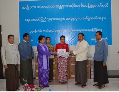 ဦးဝင်းထိန်ကျော်၊ညွှန်ကြားရေးမှူး၊ကယ်ဆယ်ရေးနှင့်ပြန်လည်နေရာချထားရေးဦးစီးဌာန+ဒေါ်ခင်မာညို၊ ဦးစီးအရာရှိမိသားစုမှ (၁) သိန်း ကျပ်တို့ကိုပေးအပ်ရာ လူမှုဝန်ထမ်း၊ ကယ်ဆယ်ရေးနှင့် ပြန်လည်နေရာချထား ရေးဝန်ကြီးဌာန၊ ပြည်ထောင်စုဝန်ကြီး၊ အမျိုးသားသဘာဝဘေး အန္တရာယ်ဆိုင် ရာစီမံခန့်ခွဲမှုလုပ်ငန်းကော်မတီ ၊ဥက္ကဌ ဒေါက်တာမြတ်မြတ်အုန်းခင်က လက်ခံ ရယူပြီး ဂုဏ်ပြုမှတ်တမ်းလွှာများ ပြန်လည်ပေးအပ်ခဲ့ကြောင်း သိရှိရပါသည်။