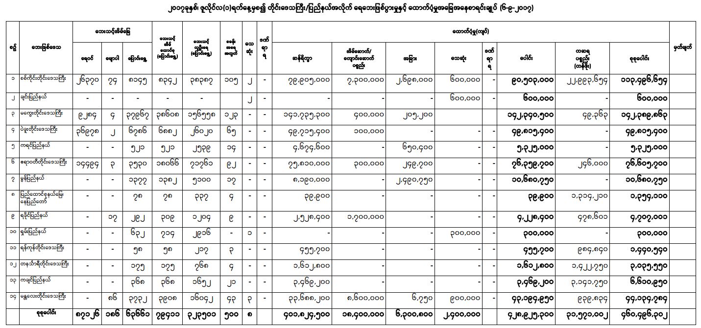 ၂၀၁၇ ခုနှစ်၊ ဇူလိုင်လ (၁) ရက်နေ့မှ စက်တင်ဘာလ (၆) ရက်နေ့အထိ တိုင်းဒေသကြီး/ပြည်နယ်အလိုက် ရေဘေးဖြစ်ပွားမှုနှင့် ထောက်ပံ့မှုအခြေအနေစာရင်းချုပ်