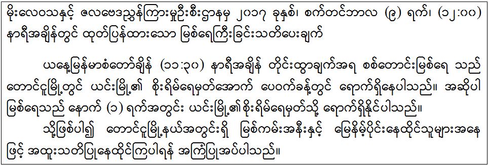 မိုးလေဝသနှင့် ဇလဗေဒညွှန်ကြားမှုဦးစီးဌာနမှ ၂၀၁၇ ခုနှစ်၊ စက်တင်ဘာလ (၉) ရက်၊ (၁၂:၀၀) နာရီအချိန်တွင် ထုတ်ပြန်ထားသော မြစ်ရေကြီးခြင်းသတိပေးချက်